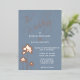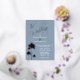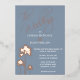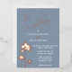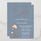 Une invitation de mariage à la plage, élégante mais simple, avec script de calligraphie or rose et motifs de palmiers tropicaux contre un arrière - plan bleu poussiéreux. Idéal pour les mariages du littoral et de destination