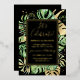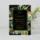 Cette invitation de célébration de mariage en fuite tropicale élégante présente des feuilles de palmier, de philodendron et de fougère vertes et dorées sur fond noir. Un cadre en feuille d'or élégant met en valeur le texte en feuille d'or. Des éclaboussures de feuille d'or accentuent ce design botanique exotique et apportent une touche de fantaisie moderne à l'invitation. "Célébrons !" ainsi que les noms des jeunes mariés sont indiqués en haut. Les détails du vœu de mariage et les informations sur la réception sont en dessous. Les informations de RSVP sont au dos de l'invitation.
