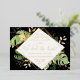 Cette élégante invitation de réception de mariage sur le thème tropical présente un feuillage exotique avec des accents dorés sur fond noir. Un cadre en feuille d'or géométrique moderne met en valeur le texte en feuille d'or. Des éclaboussures de feuille d'or accentuent le design botanique et apportent une touche de fantaisie sophistiquée à l'invitation. "Nous avons noué le noeud !" est présenté au milieu de l'invitation. C'est l'annonce de mariage et l'invitation à la réception parfaite pour tout mariage sur le thème tropical.