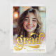 Célébrez le diplômé en style avec cette feuille d'or chic et l'invitation de graduation blanche. Doté d'un script rétro audacieux à l'avant et de quatre emplacements photo élégants à l'arrière, ce design moderne et intemporel est parfait pour annoncer votre grande réussite. Idéal pour les diplômés du secondaire ou du collège, cet invitation donne le ton d'une célébration élégante.