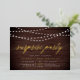 Nos invitations festives surprises comprennent un arrière - plan rustique en planches de bois avec des cordes de lumières blanches brillantes sur le dessus, et "fête surprise" dans la chic calligraphie de feuille d'or typographie script. Personnalisez avec vos détails de fête surprise sous blanc; peut être utilisé pour n'importe quelle occasion, comme les fêtes d'anniversaire ou les fêtes d'anniversaire.