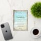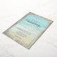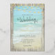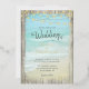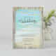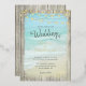 De belles vagues d'océan bleu aqua s'écrasent contre la plage dans ce design de mariage de plage encadré de bois patiné rustique, avec l'élégance ajoutée de véritables accents de feuille d'or sur les lampes à cordes et les noms du couple mariage. Ces invitations de mariage sont parfaites pour les mariages de destination, ainsi que tous les mariages à thème de la plage et du littoral.
