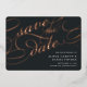 Elégant mariage enregistrer les cartes de date dans riche charbon de bois noir fonctionnalité "enregistrer la date" dans luxueux rose feuille d'or script lettering pour un look audacieux et inoubliable. Personnalisez avec vos détails mariages en lettres blanches classiques et ajoutez des informations supplémentaires au dos.