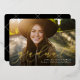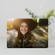 Un script ludique mais simple diplômé en feuille se trouve au bas d'une photo horizontale. Le texte personnalisé comprend la place pour le nom du diplômé ainsi que les détails de l'école et de l'année. Le dossier noir neutre est doté d'un simple motif de grille, et la couleur peut être changée en cliquant sur "customiser plus loin". Le centre a de la place pour le texte d'invitation de la fête de remise de diplômes ou il peut être laissé vide. Annoncez la réalisation de votre diplômé à vos amis et à votre famille avec ce design!