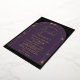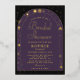 Un modèle moderne et élégant d'invitation à la douche nuptiale avec un thème céleste, lune et étoiles, tarot, voyant de fortune, avec un cadre double, or boho arch et éléments célestes : le soleil, la lune, le chalice, constellations, étoiles... sur un schéma de couleur violet, noir et or. De véritables accents de feuille d'or élèvent cette invitation à une élégante aventure. Un bel espace, univers, horoscope, zodiaque, céleste invitation à la douche nuptiale pour une mariée moderne.
