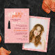 Invitation vos amis et parents à une fête célébrant votre fille à l'école de graduation avec cette mignonne invitation rétro grad party en rose avec une couleur rétro combo d'orange, rose et doré feuille avec une têle suspendue d'un arc attaché dans la courbe de l'invitation g. Retro graduation party avec un script mignon, étoiles et fusées, et un goût et de l'or foil détails. Personnalisez avec une photo de votre fille sur le dos.
