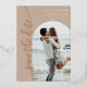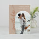 Cette carte de date minimaliste et moderne présente un cadre photo en arc de cercle élégant et d'élégants motifs en feuille dans votre choix d'or, d'or rose ou d'argent. Le design épuré permet à votre photo de prendre le centre de la scène, tandis que le script élégant et le papier d'aluminium ajoutent une touche de sophistication. L'arrière - plan taupe peut être changé en n'importe quelle couleur pour correspondre à votre mariage. Idéal pour tous ceux qui recherchent une carte de datation chic et design.