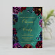 Un faire-part de mariage à bijoux bleu/vert turquoise, bleu saphir, améthyste mauve et un bordeaux rouge bordeaux dans une symphonie de tons bijoux profonds avec spray doré et contours floraux chatoyants. Vos noms sont rendus dans un script rustique de mariage or, avec une petite police moderne non serif majuscules annonçant vos détails.