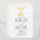 "We do" véritable feuille d'or faire-part de mariage avec belle écriture cursive style calligraphie manuscrite. Un motif géométrique en or et blanc couvre le dos.