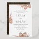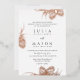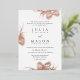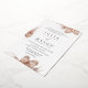 Dessin de pomme de pin en feuille d'or avec texte de style manuscrit sur un fond en bois foncé contrasté. Invitation de mariage rustique et élégante en bois.