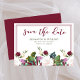 Sauvez la date Aquarelle Roses blanches Cranberry Invitation, conçu avec des grappes de roses blanches délicates, des fleurs rouges de canneberge brillantes, et mis en évidence avec des feuilles verts doux. Le texte du côté avant comprend : Enregistrer la date, Les noms de mariée et de champignon, Se marier et Mariage date. L'envers comprend l'emplacement du Mariage et l'invitation officielle à suivre. Pour personnaliser, insérez simplement vos détails dans notre modèle facile, en remplaçant l'exemple de texte.