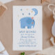 Baby shower doux mignon Invitation avec un drôle d'éléphant et la lune, étoiles dans la couleur bleu pastel.