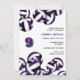 Cette invitation à la fête de volley-ball pour un anniversaire ou une fête d'équipe comporte des grappes de volley violet, noir et blanc aux bords supérieur et inférieur sur le devant et un seul cluster couvrant le dos de l'invitation - customiser les détails de la fête sur un arrière - plan blanc - par katz_d_zynes