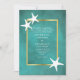 Estarfish blanche sur papier grunge turquoise vernis moderne invitation mariage de plage ou invitation avec cadre or sur aqua bleu foncé turquoise arrière - plan et étoile de mer blanche aux coins. Cet élégant design mariage d'été fait partie d'un ensemble ou d'une collection de mariages et est un modèle entièrement personnalisable parfait pour un mariage d'été de destination de plage.
