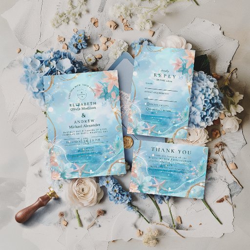 A soft, luminous coastal wedding design inspired by sunlight over calm waters. Delicate watercolor blues blend with floating starfish, gentle florals, and subtle golden accents to create an airy, dreamlike atmosphere.