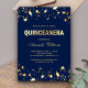 Éblouissez vos invités avec cette élégante invitation de Quinceañera avec de belles étoiles dorées et une typographie moderne. Ajoutez simplement les détails de votre événement sur ce modèle facile à utiliser pour en faire une invitation unique. Retournez la carte pour révéler une belle texture fausse parties scintillant d'or au dos de la carte.