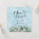 Une belle aquarelle, peinte dans un design bleu ciel, donne le décor de cette invitation... décoré de jolis eucalyptus et de verdure, et fini avec un script de typographie simple et élégant. Votre client trouvera un arrière - plan d'aquarelle assorti sur le dos, avec tous les détails de la douche.