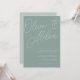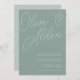Une belle faire-part de mariage typographique avec vos noms dans des lettres de script surdimensionnées en haut, en ton sur les tons pour un effet filigrane. Personnalisez avec vos détails de mariage dans les lettres serif classiques alignées en bas à droite. Notre colorway Eucalyptus est un élégant mélange de vert poussiéreux, avec des lettres vert pâle et blanc sur un arrière - plan vert sage.
