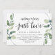 Carton d'invitation thématique Eucalyptus Rustique Moderne, écriture noire (avec titre sur la carte: Rien de fantaisiste, juste de l'amour). Il est parfait pour votre réception de mariage intime / fête de célébration post-mariage. Ajoutez vos détails dans une police / lettrage noir assorti.