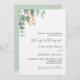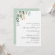 Un arrière - plan blanc chic. Décoré avec des feuilles d'eucalyptus couleur verte, des sprigs, de la verdure et un faux sprig d'or. Personnalisez et ajoutez vos noms et les détails du mariage. Lettres noires. Dos : vert sauge couleur arrière - plan.