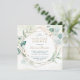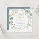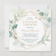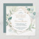 Une invitation à la douche en couple moderne avec cadre géométrique entouré de feuilles d'eucalyptus et verdure avec une pointe de bleu. À l'intérieur, vous trouverez les détails de votre événement en vert foncé ainsi que le titre et les noms du couple dans un ton or élégant, sur un lavage pastel aquarelle avec des taches de parties scintillant faux or. L'arrière est assortie d'une teinte de bleu doux et vert. Cette invitation simple et rustique conviendra à une douche à thème botanique en couple.