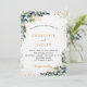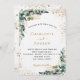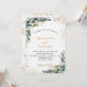Un arrière - plan blanc décoré de verdure d'eucalyptus et de feuillage doré. Personnalisez et ajoutez vos noms et les détails du mariage. Lettres noires et dorées. Retour : ajoutez votre weburl à votre site mariage pour RSVP ou détails.