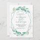 Ce faire-part de mariage tendance et élégant présente des feuilles d'eucalyptus vert aquarelle sur un arrière - plan en marbre blanc avec texte et script modernes et un design géométrique vert.