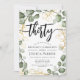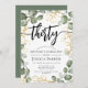 Invitation de fête du 30e anniversaire. Design botanique floral élégant en or blanc vert et faux parties scintillant. Design moderne et élégant avec aquarelle peinte à la main vert vert eucalyptus couronne et police de script. Parfait pour une trentième célébration anniversaire. Personnalisez avec vos propres détails. Peut être customisé pour n'importe quel âge ! Invitations Zazzle imprimées ou téléchargement instantané modèle imprimable numérique.