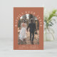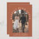 Invitation moderne de mariage intime et annonce privée en terre cuite. Le devant présente votre photo de mariage dans un cadre cintré et "Pour toujours heureux" en typographie blanche élégante. Ajoutez vos prénoms, date de mariage et lieu. Au verso, personnalisez votre annonce de mariage et invitation à la réception et ajoutez vos noms dans un script ressemblant à une signature.