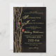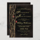 Faire-part de mariage de forêt de conte de fées sombres avec deux bourgeons roses dans une vigne d'épines, bruns foncés avec des polices d'or avec deux roses romantiques contrastées.