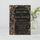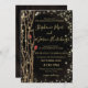 Faire-part de mariage de forêt de conte de fées foncé avec deux bourgeons roses dans une vigne d'épines, marron foncé avec des polices d'or et un contraste étincelant étoilé avec deux roses rouges romantiques.