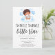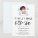 Personnalisez facilement ce faire-part de naissance garçon élégamment stylisé. Le faire-part présente un bébé souriant adorable assis sur les nuages avec les mots "twinkle twinkle little star". Recherchez bientôt les articles assortis dans la boutique !
