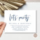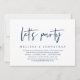 Carte d'invitation de mariage en écriture moderne bleue marine (Faisons la fête). Elle est parfaite pour votre dîner de mariage intime et décontracté au bord du lac, la danse et la fête.