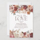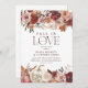 Un élégant faire-part de mariage à thème d'automne, avec la rubrique "tomber amoureux" dans le texte décoratif, des fleurs de couleur aquarelle dans les tons bordeaux, orange brûlé, rose roux et ivoire avec deux citrouilles peints à la main. Le modèle mariage qui est facile à customiser avec vos propres détails de l'événement. Parfait pour les fêtes mariages de automne.