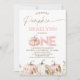 Sweet fall themed first birthday invitation for baby girl featuring four pumpkins some lovely floral arrangements and a large word one. This girl's our little pumpkin fist birthday invitation is ideal for a fall birthday.