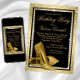 L'élégante invitation de fête d'anniversaire en noir et or de femme avec de belles chaussures talon haute or sur un élégant arrière - plan en diamant noir et or parties scintillant. Ces élégantes invitations noires et dorées à la fête d'anniversaire sont facilement customisées pour votre événement en ajoutant simplement vos détails dans le style de police et le libellé de votre choix.
