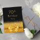 Invitation de fête élégante, classique, glamour et féminine. Un ruban et un nœud de couleur or faux avec paillettes et éclat dorés, un peu de brillance et de luxe pour un anniversaire. Fond noir. Avec le texte : 70 ans ! sur le devant