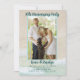 Mariage anniversaire de fête invitation pour célébrer n'importe quelle année de mariage. Sable de plage et arrière - plan de surf avec eau tropicale bleu-vert qui tapisse le rivage, est l'image derrière votre photo et texte. Un modèle photo vertical est dessiné en bleu marine. Le texte est bleu-vert foncé avec une formulation minimale. L'année de l'anniversaire est en haut de la photo, avec les noms du couple en-dessous. En majuscules, le texte imprimé est ajouté à l'aide de cinq lignes max. Reverse a également une scène de plage.