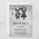 Êtes-vous prêts à inviter vos amis et votre famille à la fête d'Halloween la plus effrayante de l'année ? Venez rejoindre le côté effrayant et déjanté de la saison des fêtes avec une célébration conjointe qui va faire hurler de joie tout le monde. Ces invitations de fête conjointe d'Halloween présentent un décor écrit à l'ancienne, une toile d'araignée, un clown effrayant, une fille gothique et un modèle de texte effrayant facile à personnaliser.