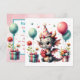 Invitations à la fête d'anniversaire pour une fête d'anniversaire pour petite fille. Dragon à l'aquarelle mignon avec un casquette d'anniversaire et ballons roses et turquoise, fleurs, papillons et cadeaux. Mignonne pour toutes les petites filles qui aiment les dragons.