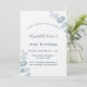 Un arrière - plan blanc, décoré de tiges d'eucalyptus bleu foncé, sprigs. Personnalisez et ajoutez un nom et des détails du parti. Dos : arrière - plan bleu poussiéreux.