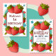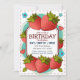 Célébrez votre anniversaire avec ces invitations amusantes aux fraises. Au centre de l'invitation sont des modèles pour ajouter tous vos détails à l'intérieur d'une boîte blanche avec un bord de marron foncé. Autour de la boîte de détails sont des fraises rouges juteuses avec des feuilles verts. On trouve aussi des fleurs bleues mignonnes et des coeurs d'amour roses.