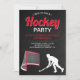 Invitation vos invités avec cette invitation de fête d'anniversaire cool avec un filet et un joueur de hockey sur glace avec typographie moderne sur un arrière - plan de tableau noir. Ajoutez simplement les détails de votre événement sur ce modèle facile à utiliser pour en faire une invitation unique. Retournez la carte pour révéler un motif rayé au dos de la carte.