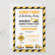 Mignonne en construction invitation fête d'anniversaire. Jaune, blanc noir et gris avec camion de construction, panneau de prudence et motif de cône de construction.