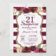 Invitation de fête d'anniversaire de surprise florale de Bourgogne 21ème pour des femmes. Rouge de Bourgogne et invitation de fête d'anniversaire d'or. Parties scintillantes d'or. Fleur florale d'aquarelle de Bourgogne. Bourgogne et rayures blanches. 13ème 15ème 16ème 18ème 20ème 21ème 30ème quarantième cinquantième soixantième soixante-dixième quatre-vingtième quatre-vingt-dixième 100th, tous âges. Digitals imprimables. Pour davantage de personnalisation, cliquez sur svp la "personnaliser il" bouton et utilisez notre outil de conception pour modifier ce modèle.