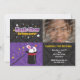 Cette invitation de partie de spectacle de magie comporte un lapin blanc jetant un coup d'oeil hors du casquette supérieur d'un magicien, d'une baguette magique magique, d'un endroit pour la photo de votre enfant et du texte personnalisable pour votre information de partie.