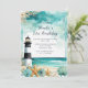 Belle invitation de fête d'anniversaire avec un phare noir et blanc nautique, étoiles de mer et coquillages. Parfait pour une fête d'anniversaire. Les mots peuvent être changés en fonction de vos propres détails ou exigences