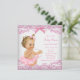 Invitation de fête de bébé rose et blanc avec une adorable petite fille portant un tutu rose et un collier de perles sur un joli fond de dentelle rose en spirale et ruban. Cette invitation de fête de bébé rose mignonne est facilement personnalisable pour votre événement en ajoutant vos détails dans le style de police et la couleur, et la formulation de votre choix. Il s'agit d'un design imprimé sans véritable dentelle, rubans, perles, etc.
