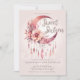 Une illustration d'aquarelle enchanteresse avec une lune rose onirique avec un attrapeur de rêve et des décorations florales, ainsi que des cristaux roses, peints en aquarelle avec des accents de parties scintillant dorée (ce sont des effets numériques, pas de vrai papier d'aluminium), décorent cette élégante invitation Sweet 16 slumber party. Un choix parfait pour les amateurs de boho-chic qui adorent les cristaux, la lune et le charme des soirées sombres. Faites de votre célébration une véritable particularité grâce à cette invitation unique, artistique et rêveuse.