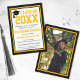 Cette invitation Black and Gold Photo Graduation Party est une excellente façon de célébrer le baccalauréat ou le diplôme de l'université. Personnalisez ceci avec le nom, l'école, l'année, les détails de la fête et la photo du diplômé au dos. Cet invitation présente une typographie audacieuse aux couleurs de l'école de noir et d'or avec une bordure noire et or.